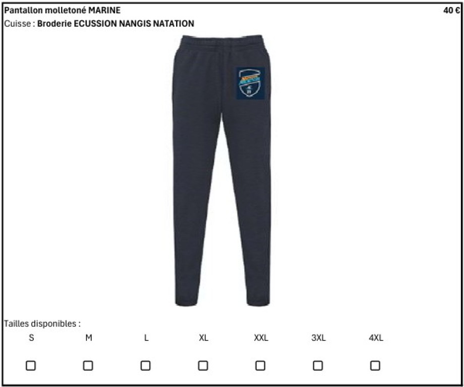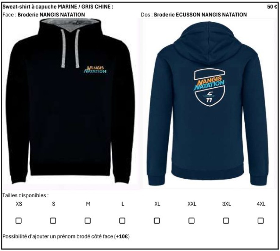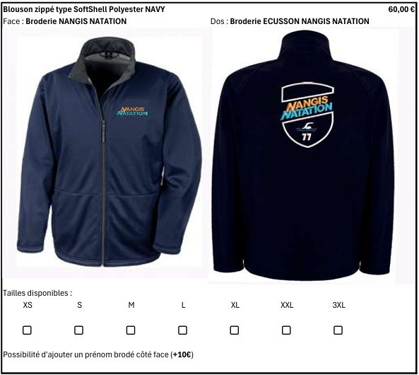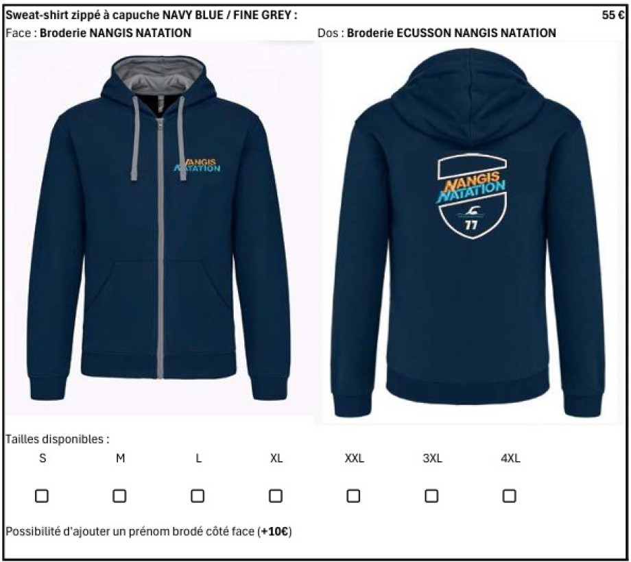 Les membres du bureau de NANGIS NATATION ont sélectionnés pour vous des articles auprès de notre fournisseur de produits, à savoir "Espace Broderie" à PAMFOU. Nous vous proposons de pouvoir acheter les produits suivants :